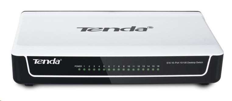 16ti portový Fast Ethernet switch S16 výrobce Tenda Technologies, založený na chipsetu IC+, vás zaujme svými kompaktními rozměry a přitažlivým designem. Plně podporuje standardy 802.3, 802.3u a 802.3X. Je určený pro použití v domácnostech a menších firmách. Tenda S16 přepíná data v síti pomocí 16 portů RJ45 s přenosovou rychlostí 10/100 Mb/s, automatickou detekcí rychlosti a typu připojeného kabelu. Zařízení je napájeno externím zdrojem. Plastový obal.