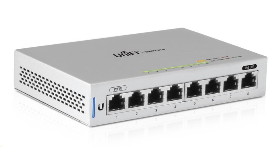 UniFi Switch US-8 je plně menežovací gigabitový switch s podporou PoE in na portu 1, PoE out na portu 8 (max.12W) a možností integrace do SDN sítí pomocí UniFi Controlleru (v 4.3 a vyšší). Lze napájet přiloženým adaptérem případně na portu 1 pasivním PoE 48V nebo aktivním PoE 802.3af/at. Vyznačuje se vysokým výkonen 8Gbps (non-blocking throughput), spolu s pokročilými L2/L3 funkcemi.