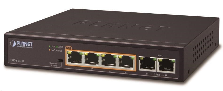 Planet FSD-604HP Switch, 4x PoE 802.3at 60W+ 2x 100Base-TX, VLAN, extend mód 10Mb/s do 250m, fanless, ESD