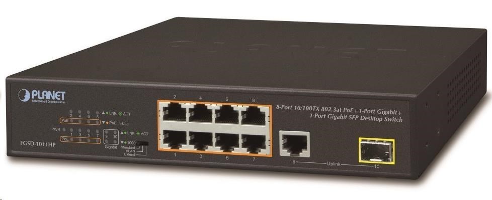 Planet FGSD-1011HP Switch, 8x 10/100 PoE, 1x TP + 1x SFP 1000Base-X, extend mód 10Mb, ESD, 802.3at 120W, fanless
