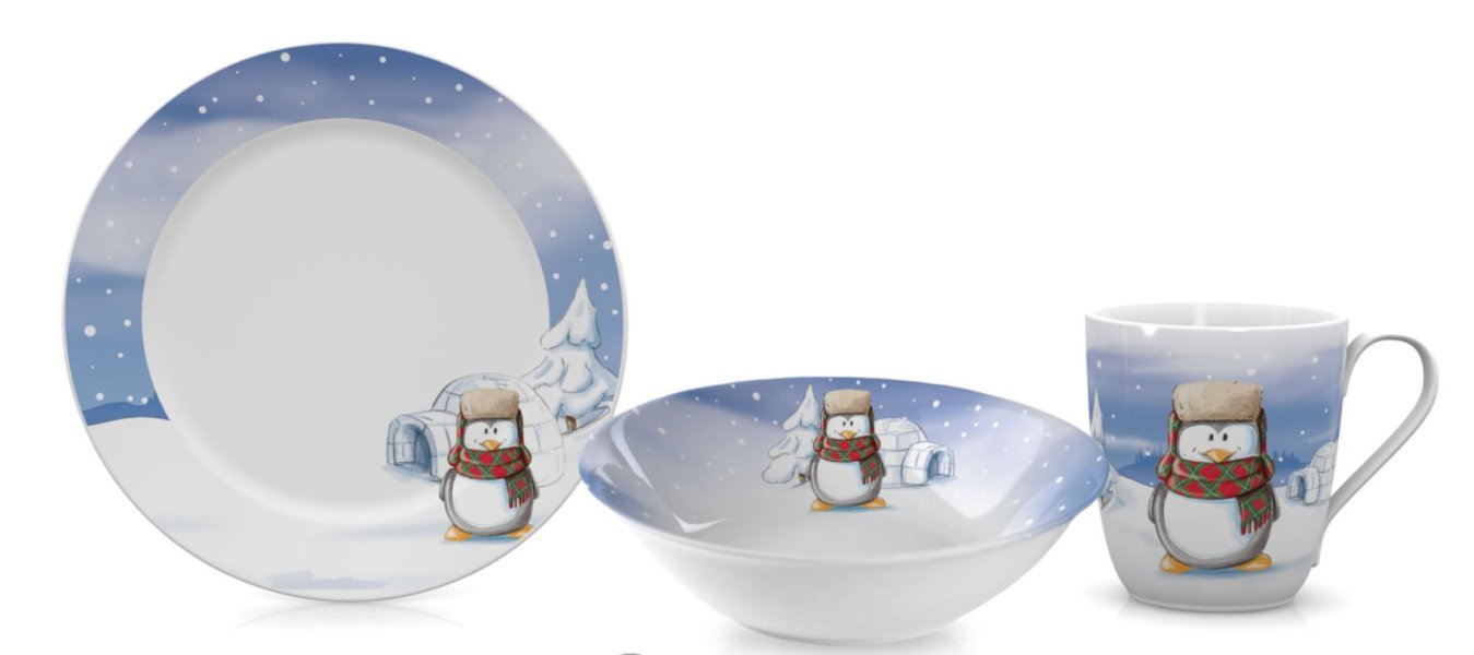 Dětská jídelní souprava nádobí PENGUIN s krásným zimním motivem. Souprava obsahuje: 1x hrneček 290 ml, 1x talířek a 1x miska. Materiál - porcelán. Rozměry: talířek - průměr 20,5 cm, miska - průměr 18 cm. číst celé