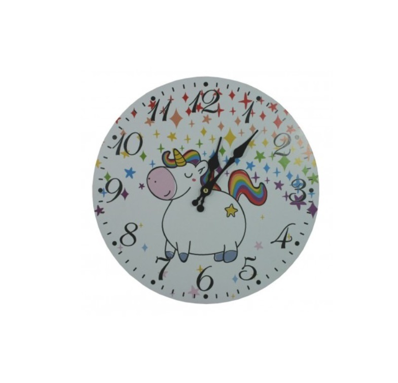 Nástěnné hodiny s veselým dětským motivem jednorožce. Napájení - 1x 1,5V AA baterie. Materiál - dřevo. Rozměry - průměr 34 cm.