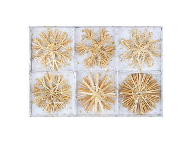 Sada 12 ks slaměných ozdob v různých tvarech sněhových vloček s glitry na Vánoční stromeček.Přírodní, ručně vyrobené vánoční ozdoby.