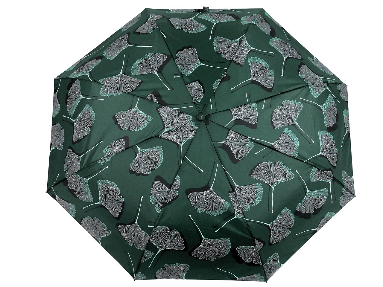 Dámský skládací deštník zaujme svým potahem s listy ginkgo. Rozevírá se stisknutím tlačítka na rukojeti. Rukojeť je plastová, opatřená poutkem. Deštník je velice pevný, odolá náporům větru. UV filtr vás ochrání před slunečním zářením. Konstrukce deštníku se skládá z osmi polí. Součástí deštníku je ochranný obal.