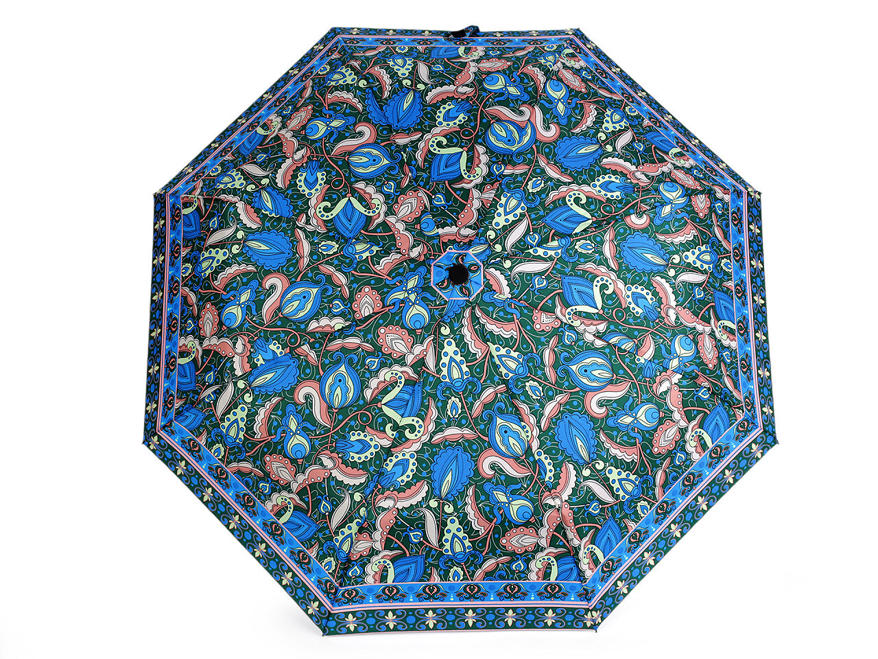 Velký dámský deštník je skládací, plně automatický Je vyrobený z kvalitního materiálu. Na potahu deštníku je poutavý paisley motiv. Deštník má vystřelovací / sestřelovací mechanizmus. Rozevře i zavře se stisknutím tlačítka se šipkou nahoru nebo dolů. Rukojeť deštníku je plastová, opatřená poutkem. Konstrukce deštníku se skládá z osmi polí. Součástí deštníku je ochranný obal.