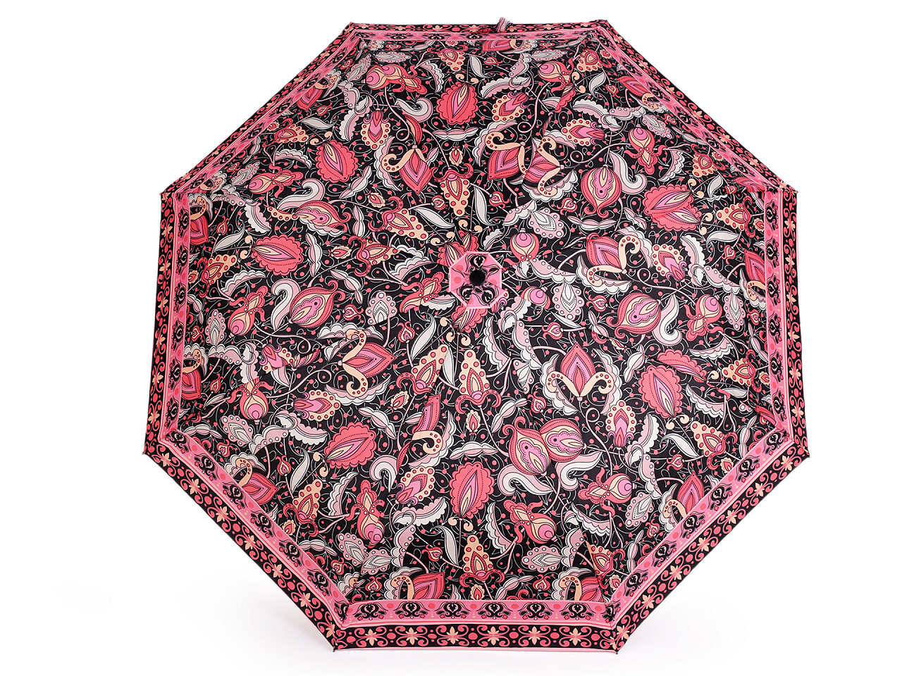 Velký dámský deštník je skládací, plně automatický Je vyrobený z kvalitního materiálu. Na potahu deštníku je poutavý paisley motiv. Deštník má vystřelovací / sestřelovací mechanizmus. Rozevře i zavře se stisknutím tlačítka se šipkou nahoru nebo dolů. Rukojeť deštníku je plastová, opatřená poutkem. Konstrukce deštníku se skládá z osmi polí. Součástí deštníku je ochranný obal.