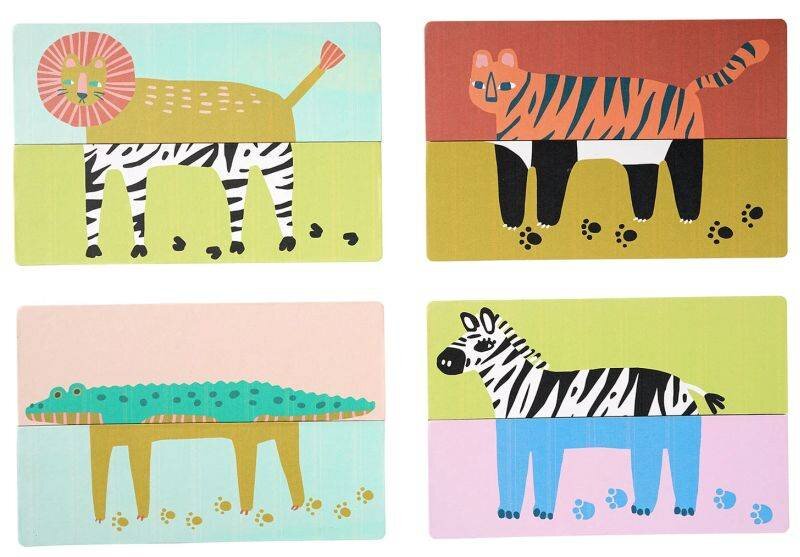 Ułóż 10 sylwetek zwierząt, łącząc ze sobą dwie karty na raz. Mieszaj lub dopasowuj karty, aby tworzyć realne lub własne zwierzęce kreacje. Krokodyl-flaming... dlaczego nie?! Dodatkowo, jeśli umieścisz karty z wzorem do dołu, możesz wprowadzić element gry pamięciowej. Zestaw zawiera 20 kart przedstawiających 10 różnych postaci zwierząt- pandę, słonia, tygrysa, krokodyla, leniwca, lwa, zebrę, iguanę, tukana i flaminga. Karty można przechowywać w estetycznym pudełku.Wymiary opakowania: 24,2 x 16,2 x 3,5 cmWymiary karty: 24 x 8 cm