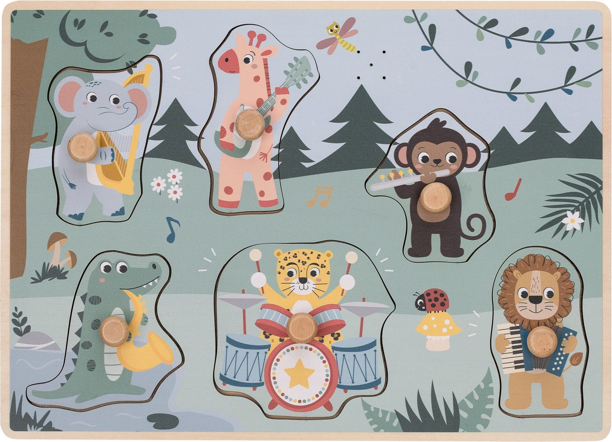 Dřevěné zvukové puzzle s obrázky zvířátek z džungle. Veselá zvířátka z džungle vydávají po vložení zvuky. Děti se naučí rozpoznávat zvířátka i jejich zvuky. Toto dřevěné puzzle podporuje představivost, stimuluje smysly a pomáhá rozvíjet jemnou motoriku a koordinaci oko-ruka.