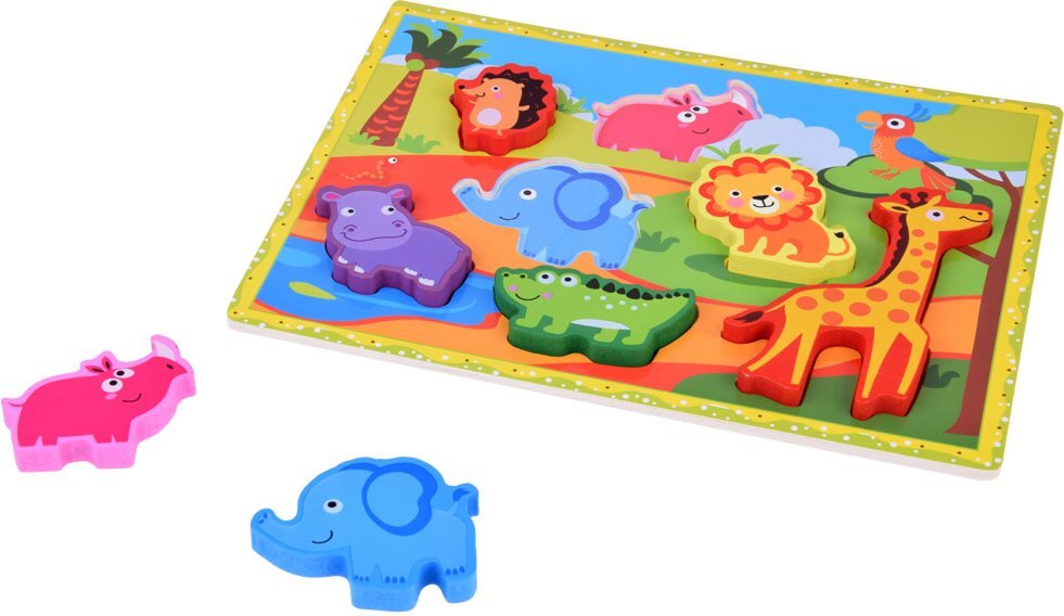 Dřevěná skládačka spojuje prvky zábavy a vzdělávání. Barevné ilustrace a legrační, usměvavá zvířátka motivují dítě ke hře. Při hraní si dítě procvičuje své pozorovací schopnosti, schopnost porovnávání a koordinaci oka a ruky. Zároveň se dítě může naučit názvy exotických zvířat, která známe především ze zoologických zahrad.