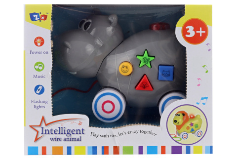 Tahací hroch na baterie (2xAA - nejsou součástí balení). Materiál plast. Po vložení baterií hroch vydává zvuky zvířátek dle obrázků na tlačítkách. Baleno v krabici. Rozměry balení cca 20,5x16,5x9,5 cm. Věk 3+ číst celé