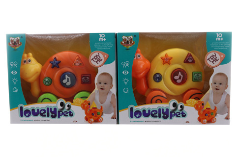 Tahací šnek na baterie. Napájení na 2xAA baterie, které nejsou součástí balení. Šnek hraje melodie a zvuky zvířátek. Materiál plast. Baleno v krabici. Rozměry balení 19x16x9,5 cm. Věk 10m+