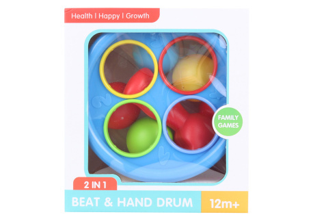 Plastová zatloukačka 2 v 1. Z jedné strany zatloukačka z druhé strany bubínek. Součástí balení je olastové kladivo a 4 míčky. Rozměr balení cca 18,5 x 20,5 x 10 cm. Věk 12 měsíců +