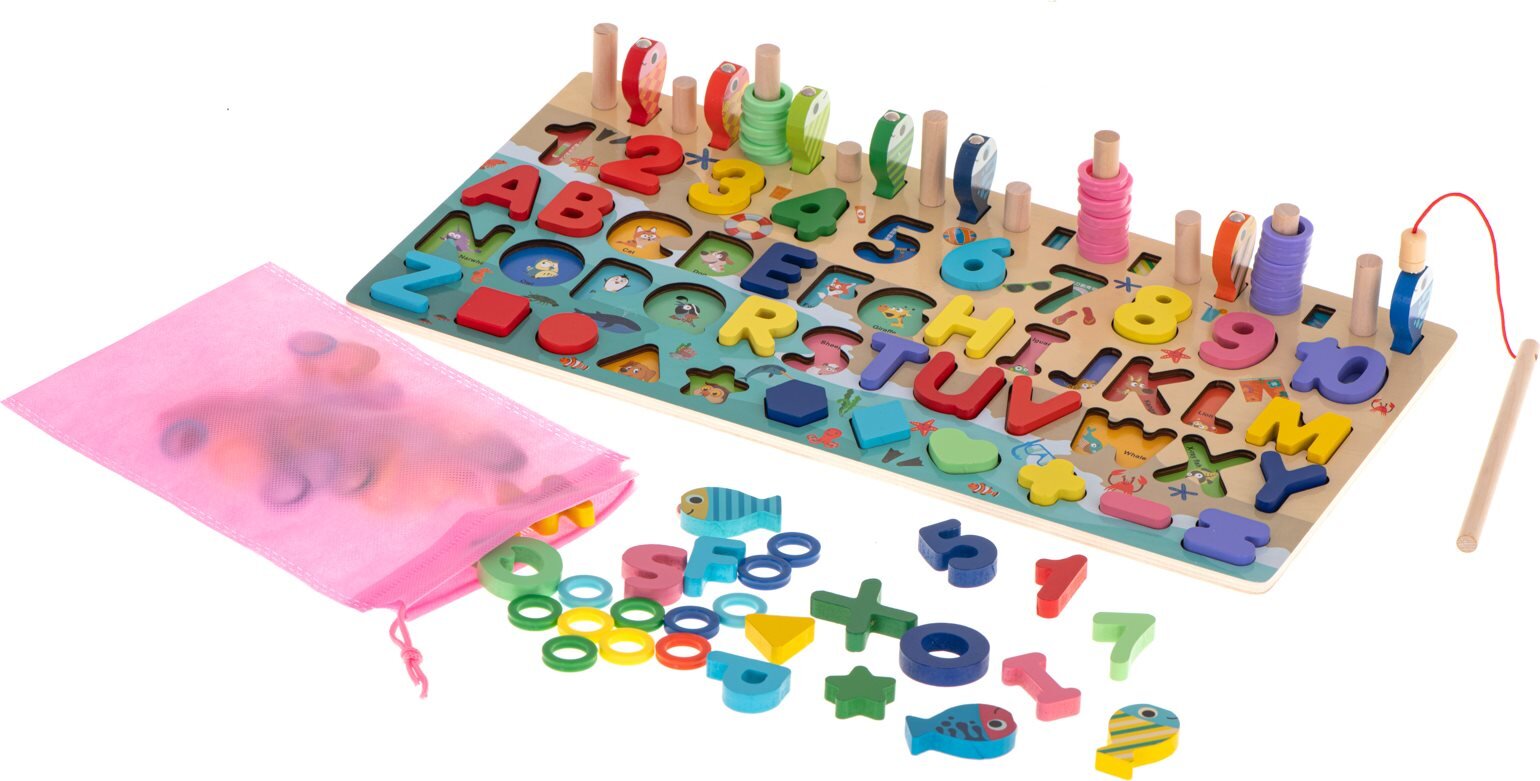 KIK Dřevěná vkládačka s abecedou, tvary, čísly a lovením rybek 3v1