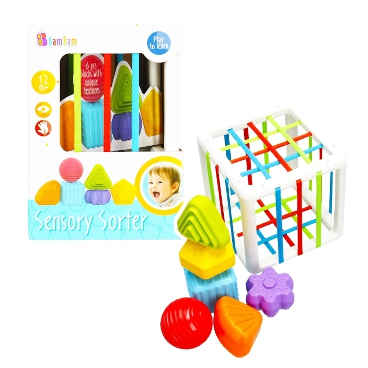 Kostka, jejíž stěny jsou upleteny z barevných pružných linií, navíc funguje jako třídička, do které můžete cihly jednoduše házet a ukládat tam. Odstraňování bloků opět vyžaduje velkou koncentraci a zapojení batolete, učí vytrvalosti odměňováním námahy.