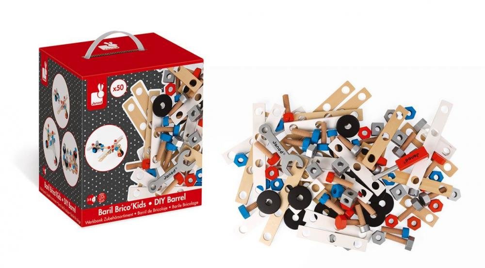 Dětské nářadí a šrouby pro malé mistry BricoKids Janod je nadčasová dřevěná skládačka pro malé architekty. Dřevěná hračka je tvořena ze základní nářadí a 100 ks dílků, které se dají poskládat na mnoho způsobů. Dřevěná skládačka je výborná pro malé kutily, řemeslníky a architekty, kteří rádi vytvářejí a skládají nové věci. Chlapci si mohou poskládat různé dopravní prostředky nebo jiné stavby, při této skládačce se děti zaručeně nikdy nebudou nudiť.Drevená hračka rozvíjí nejen motoriku a zručnost dětí ale i fantazii a představivost. Dětská dřevěná skládačka je nadčasová dřevěná hračka, je vyrobena z kvalitního dřeva a zdravotně neškodných a odolných barev. Její jedinečný design, realistické provedení a poutavé barvy zaručí, že se s ní rád zahraje každý malý chlapček.Obsahuje 50 ks příslušenství: 12 matic, 12 šroubů, 7 podložek, 14 destiček, 3 bloky, 1 šroubovák a 1 klíč. Včetně návodu.Hračka je vhodná od 3 do 8 rokovRozmery balení: 18.5 x 18.5 x 21 cm.