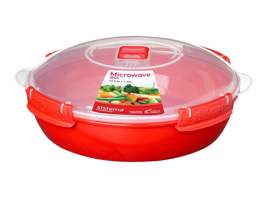Sistema® Microwave™ Kulatá miska o objemu 1,29 l je must-have doplněk do vaší kuchyně, pokud hledáte pohodlný a bezpečný způsob, jak skladovat a ohřívat jídlo v mikrovlnné troubě. Díky speciálnímu ventilu můžete ohřívat pokrmy i s nasazeným víčkem, což zabraňuje ušpinění mikrovlnné trouby a usnadňuje úklid.