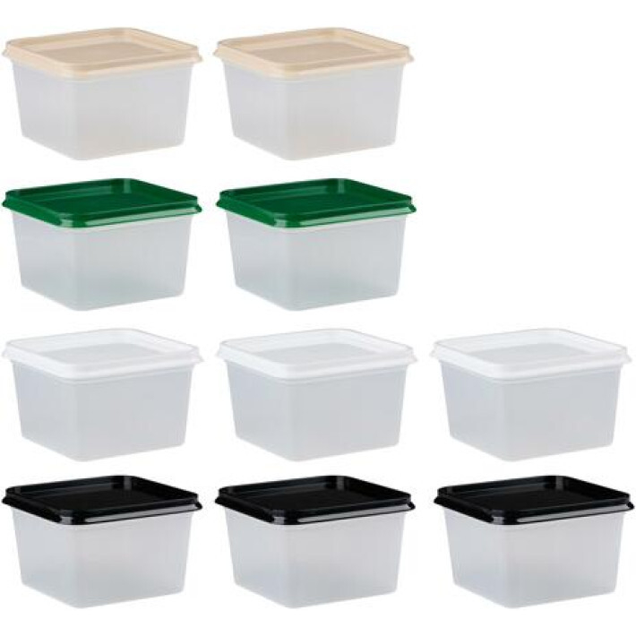 Sada 10 praktických dóz je ideální pro skladování, zmrazování i ohřívání potravin, ale můžete je využít i jinde v domácnosti. Různobarevná pružná víčka perfektně drží a těsní. Jsou vhodné do mikrovlnné trouby, chladničky i mrazničky.