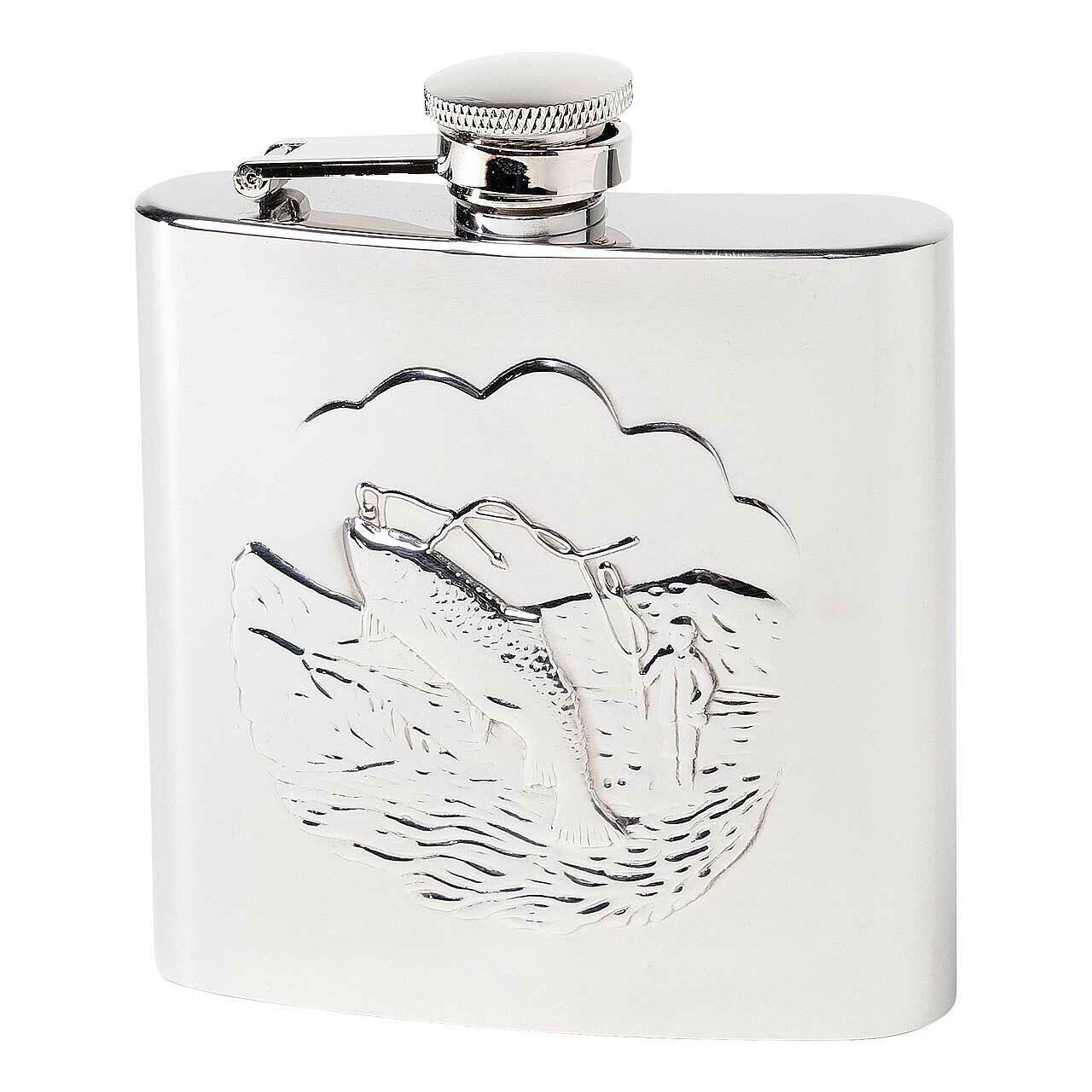 Vrecková fľaška/ploskačka Herbertz 545114 Edelstahl Fisch 177ml vyrobená z nerezovej ocele, so zrkadlovo lešteným povrchom s rybárskym motívom na prednej strane. Vybavená skrutkovacím uzáverom.