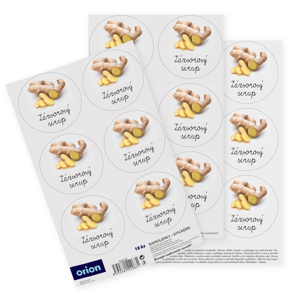 Samolepky na láhve nebo sklenice s domácím zázvorovým sirupem označí i ozdobí váš domácí produkt. Sada 18 ks. Součástí balení je recept na zázvorový sirup. Rozměry: pr. 5,4 cm. číst celé