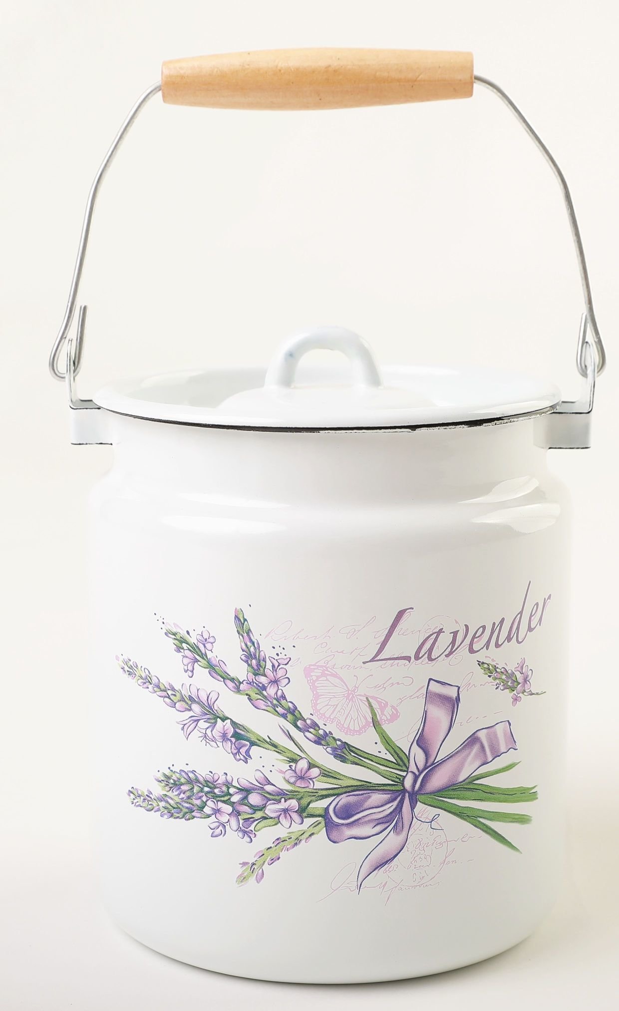 Bandaska na mléko o objemu 3,5 l s motivem levandule. Materiál - smalt. Rozměry - výška (bez víčka) 18 cm, výška ( s víčkem) 20 cm, průměr 16 cm.