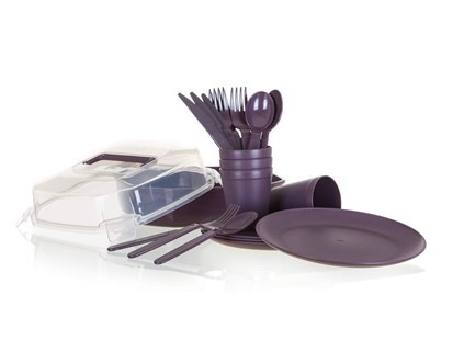 - Vše, co potřebujete na jídlo pro 4 osoby - kompletní set talířů, kelímků a příborů.