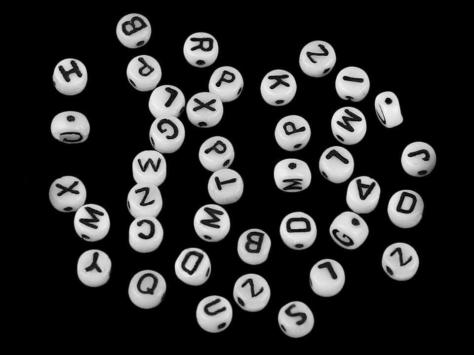 Korálky mají tvar kulaté placičky o průměru 6 mm s průvlekem umístěným horizontálně, což usnadňuje sestavování slov a jmen. Tělo korálků je bílé barvy a písmena jsou výrazná, černá, čímž zajišťují skvělý kontrast a čitelnost. Pro navlékání můžete použít různé návlekové materiály, jako jsou pruženky nebo nylonové silony.