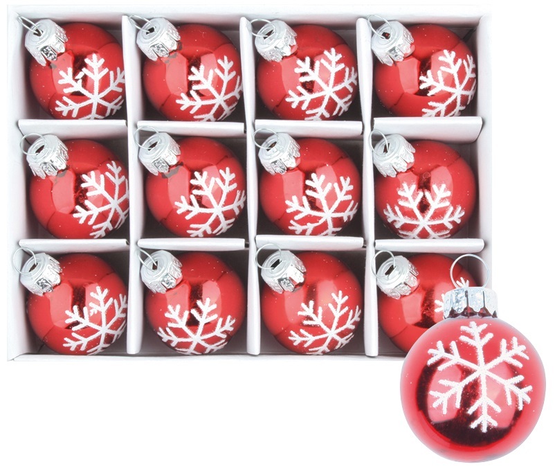 Sada skleněných baněk červených s bílou vločkou 3 cm, 12 ks