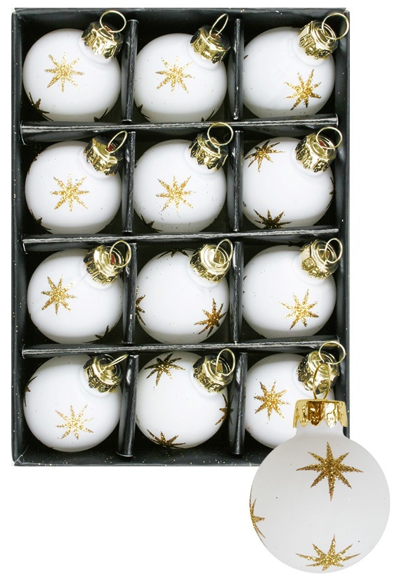 Sada skleněných baněk bílých s hvězdou 3cm, 12ks