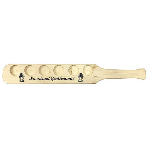 Dřevěný držák na skleničky na alkohol pro 6 kamarádů. Slavíte s kamarády a přáteli a potřebujete servírovat panáčky s alkoholem na přípitek? Využijte dřevěný stojan, kterým bez problémů obsloužíte celou společnost. Držák na skleničky pro muže s nápisem - Na zdraví, Gentlemani. Originální dárek pro muže na společné oslavy a gentlemanské přípitky.