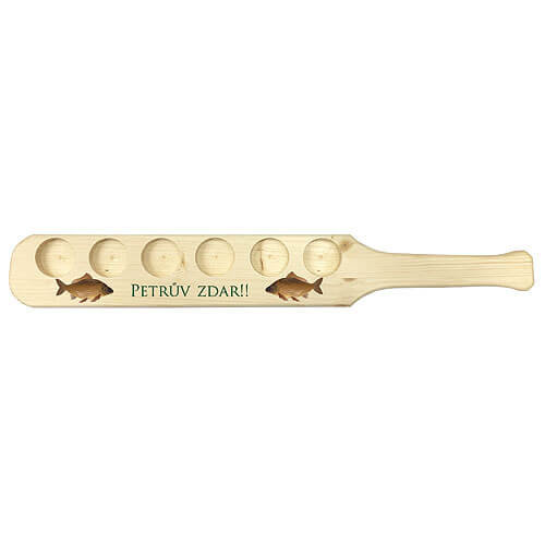 Dřevěný držák na skleničky na alkohol pro 6 kamarádů. Slavíte s kamarády a přáteli a potřebujete servírovat panáčky s alkoholem pro přípitek? Využijte dřevěný stojan, kterým bez problémů obsloužíte celou společnost. Držák na skleničky pro rybáře s nápisem - Petrův zdar. Originální dárek pro rybáře na společné oslavy a zapíjení bohatého úlovku.
