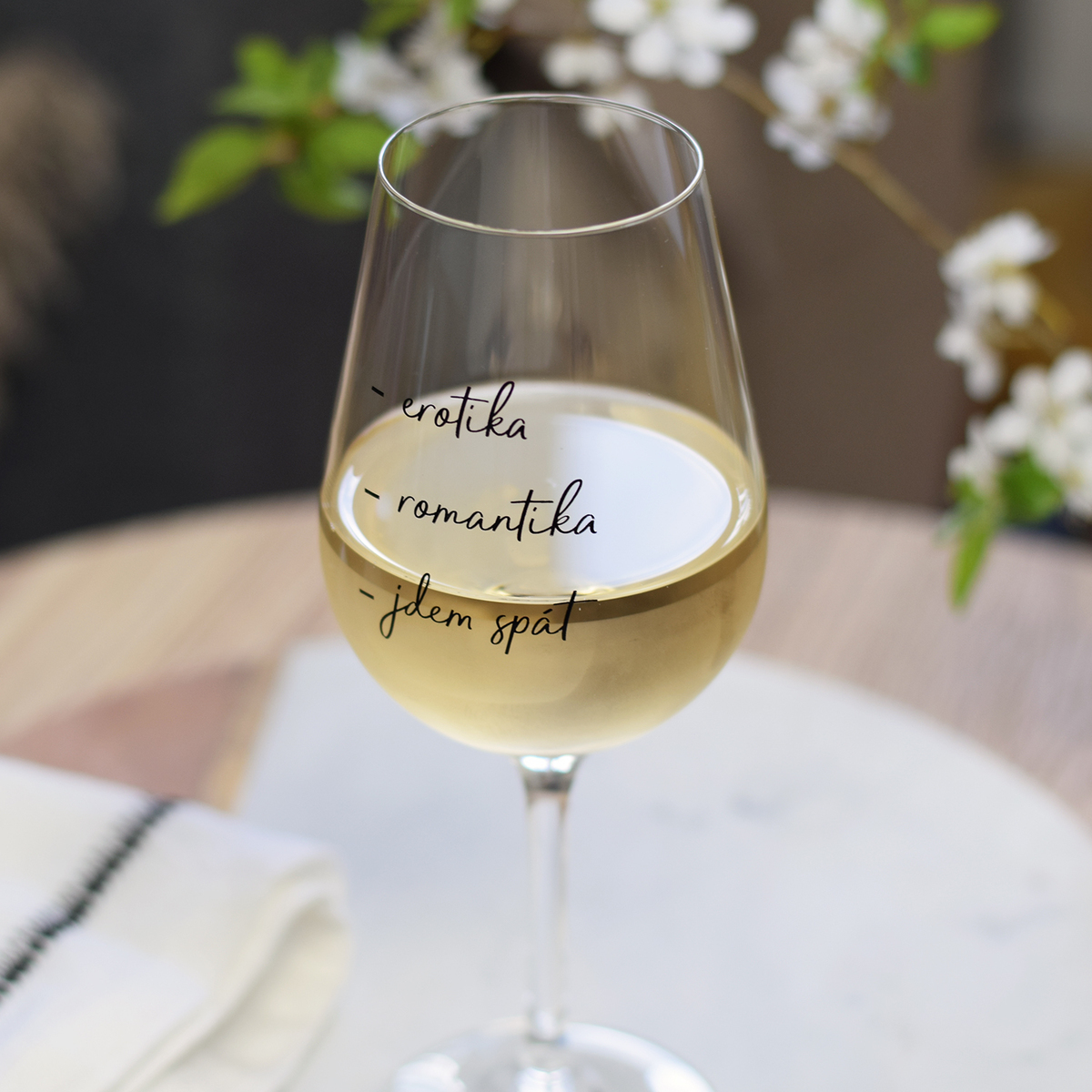Sklenice na víno - "Erotika, romantika, jdem spát."