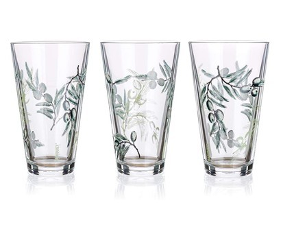 Sada sklenic City long drink OLIVES 340 ml A3 se skládá z čirých sklenic s dekorem olivy, kónický tvar, horní průměr 8,2 cm, dolní průměr 4,9 cm, výška 13,5 cm.