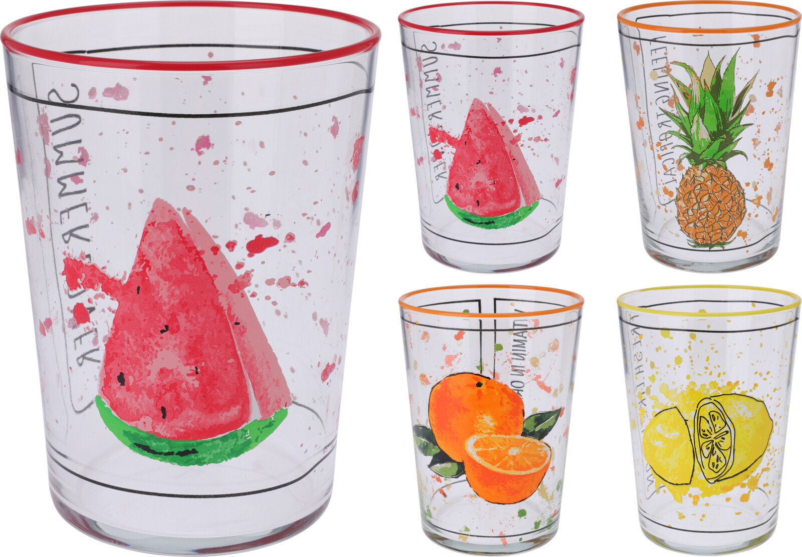 Osvěžte svůj den s pestrou sklenicí plnou ovoce! Přineste si radost a energii přímo na stůl díky této sklenici s barevným dekorem tropického ovoce.
