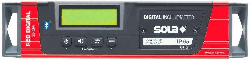 SOLA - RED 25 - digitální sklonoměr 25cmVÝHODY RED DIGITAL:- Tolerance měření modulu Solatronic:0,05° při 0° a 90°0,1° mezi 1° a 89°- Rozhraní Bluetooth pro použití aplikace SOLA Measures- Přepínatelné zobrazení sklonu ve °, %, mm/m a in/ft- Funkce "Hold" pro ukládání naměřených hodnot a pro přenos úhlů- Komfortní odečítání hodnot díky reverznímu zobrazení při měření otočeném o 180°- Stupeň krytí IP65APLIKACE RED DIGITAL:- Horizontální měření- Vertikální měření- Měření úhlu/sklonu TECHNICKÁ DATA:Stupeň krytí: IP65Materiál: HliníkPovrch: S povrchovou úpravouBarva: ČervenáHmotnost profilu: 890 g/mTolerance měření ve standardní poloze: 0.50 mm/m (0.029°)Tolerance měření v obrácené poloze: 0.50 mm/m (0.029°)Počet horizontálních libel: 1Počet vertikálních libel: 1 Měřicí plocha: S povrchovou úpravouKoncovka: 2díl.