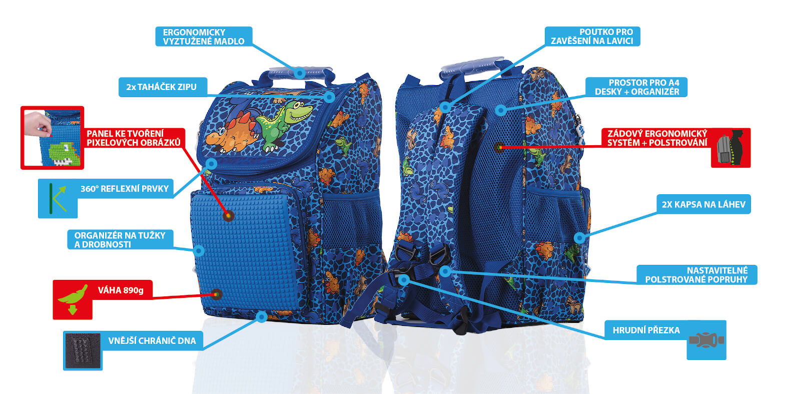 Po obou stranách aktovky jsou síťovinové kapsy, do kterých lze umístit láhev. Ty jsou ve spodní části vyztužené pevnou látkou a v horní části je našitý praktický elastický pásek, aby obsah nevypadl. Pro komfortní užívání má aktovka ergonomicky tvarovaná polstrovaná záda s ventilací a posuvný zádový systém umožňující nastavení optimální polohu popruhů vzhledem k výšce dítěte. Popruhy jsou široké a polstrované, aby se nezařezávaly. Pro pohodlné přenášení v ruce je aktovka vybavena polstrovaným úchytem s ergonomickým chráničem, pro zavěšení slouží pevné poutko.