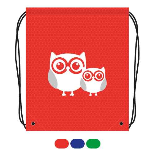 Textilné vrecko na prezúvky s farebnou potlačou na prednej strane, so zarážkami na zaťahovanie na oboch stranách. Rozmer 34 x 39 cm, v ponuke v 3 farbách. Materiál: polyester.