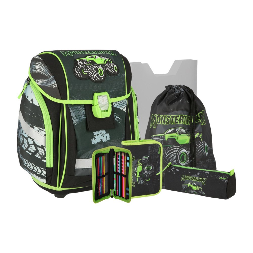 Sada: školská taška + vrecko na prezúvky + peračník + penál + box na zošity A4, v motíve monster truck.