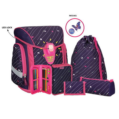 Set obsahuje: školskú tašku, vrecko na prezúvky, 19-dielny peračník, puzdro na pera, peňaženku a 2 stickery.