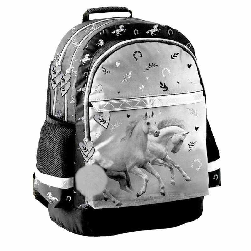 Plecak szkolny Koń. Plecak posiada dwie pojemne komory oraz dwie duże kieszenie frontowe. Dodatkowo jest wyposażony w dwie boczne kieszonki z siatki, które doskonale nadają się do przechowywania drobniejszych akcesoriów lub butelki z napojem. Usztywnione gąbką, ergonomiczne wyprofilowane plecy oraz regulowane szelki pokryte miękkim materiałem zapewniają dziecku prawidłową postawę i odciążają kręgosłup. Plecak wyposażony jest w usztywnione dno, wzmocnione i zabezpieczone gumowymi stopkami. Na froncie, bokach i z tyłu posiada elementy odblaskowe, które zwiększają bezpieczeństwo. Uszyty jest z materiału odpornego na przemakanie. Idealnie sprawdzi się zarówno w szkole czy na wycieczce.Wymiary produktu: 41x28x18cm