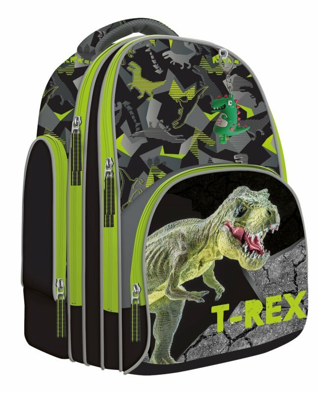 Plecak szkolny premium T-Rex.Funkcjonalność:- 2 komory,- 1 kieszeń przednia zapinana na suwak,- 1 kieszeń boczna zapinana na suwak,- 1 elastyczna kieszeń boczna,- specjalna wewnętrzna przegroda na laptopa czy tablet, dodatkowo wzmocniona i pokryta ochronnym polarem,- dodatkowa wewnętrzna elastyczna kieszeń na przybory szkolne,- wewnętrzny organizer z zawieszką na klucze,- uchwyt do wieszania plecaka,- gadżeciarski brelok.Komfort i bezpieczeństwo:- plecak przyjazny dziecku,- idealny dla klas 1-3,- wolny od substancji alergizujących i rakotwórczych,- system Venti Stream zapewniający przepływ powietrza pomiędzy plecami dziecka a plecakiem,- anatomicznie profilowane, usztywniane plecy,- panel stabilizujący, chroniący odcinek lędźwiowy,- szerokie i miękkie szelki z regulacją długości,- pas piersiowy z płynną regulacją,- liczne elementy odblaskowe - blisko 5 metrów bieżących odblasków,- szeroka i miękka rączka do przenoszenia,- wzmocniony i nieprzemakalny spód,- miejsce na podpisanie plecaka.Wymiary produktu: 31x37x20cmPojemność: 22l