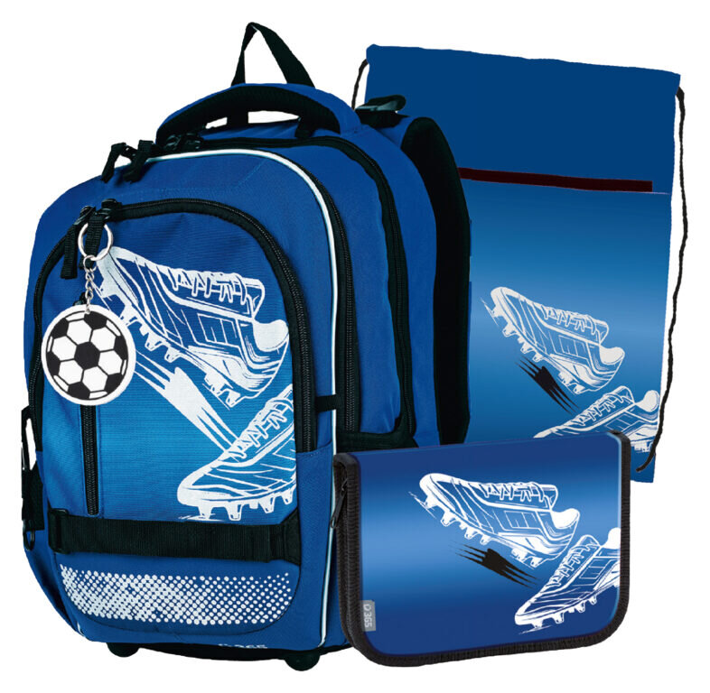 1. Školní batoh junior - kvalitní, ergonomicky tvarovaný odlehčený školní batoh je vybaven reflexními prvky a anatomicky tvarovanými zády s pevnou konstrukcí. Batoh roste s dítětem 2. Školní penál jednopatrový, prázdný s dvěma chlopněmi, o rozměru š. 19,5 x v. 4,5 x h. 13,5 cm 3. Školní sáček na cvičky vhodný pro žáky 1. stupně ZŠ vyroben z pevného, kvalitního materiálu. Rozměr sáčku na přezůvky 44 x 32 cm.