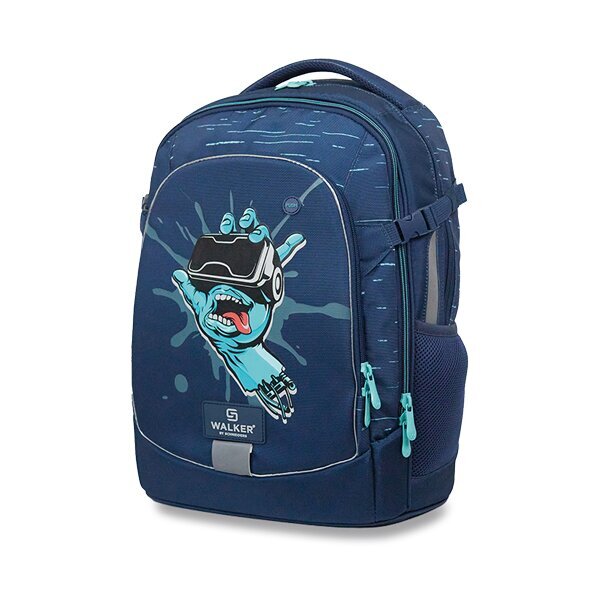 Školní batoh Graffiti Hand z řady Walker Fame s reflexními prvky. Batoh má polstrovaná záda s odvětráváním, anatomicky tvarované a výškově nastavitelné polstrované kompresní ramenní popruhy s nastavitelným hrudním popruhem. Konstrukce zad je s prodlouženým polstrováním a prodlouženou dolní pevnou konstrukcí pro lepší stabilitu. Na batohu jsou LED svítící okraje přední kapsy a reflexní prvky pro bezpečnost školáka. 3 komory a další funkční členění.