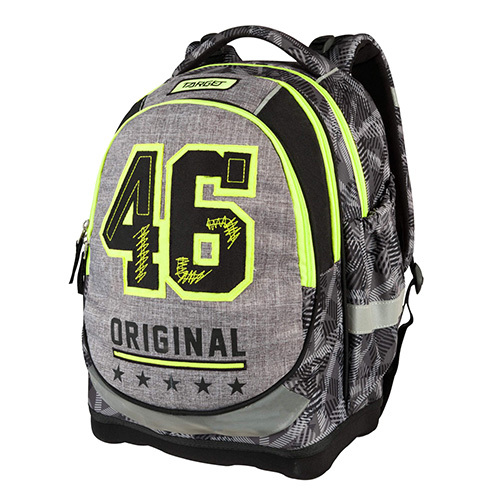 Perfektně zpracovaný školní batoh s vnitřním dvoukomorovým prostorem, kde druhá kapsa je oddělena přepážkou. Prostorná přední kapsa s praktickým organizérem a plastovou karabinkou na klíče. Všechny kapsy jsou uzavíratelné kvalitním dvoucestným zipem. Přední stranu zdobí krásný motiv 46 Original.Anatomicky tvarovaná záda s měkkou vnější vložkou zajistí prodyšnost, vyztužené dno se čtyřmi kulatými podpěrami a vnitřní kovová výztuha udrží stálý tvar batohu. Dále jsou součástí dva pohodlné ramenní popruhy s polstrováním a měkkým poutkem do ruky. Kapsy na láhev po obou stranách batohu. Reflexní prvky zajistí bezpečnost dítěte v silničním provozu.Parádní batoh, který udělá velkou radost všem mladším školákům! Vhodný pro 1. a 2. třídu základní školy.Rozměry: výška 42 cm, šířka 32 cm, hloubka 18 cm. Váha batohu: 900 g.Materiálové složení: 100% polyester.