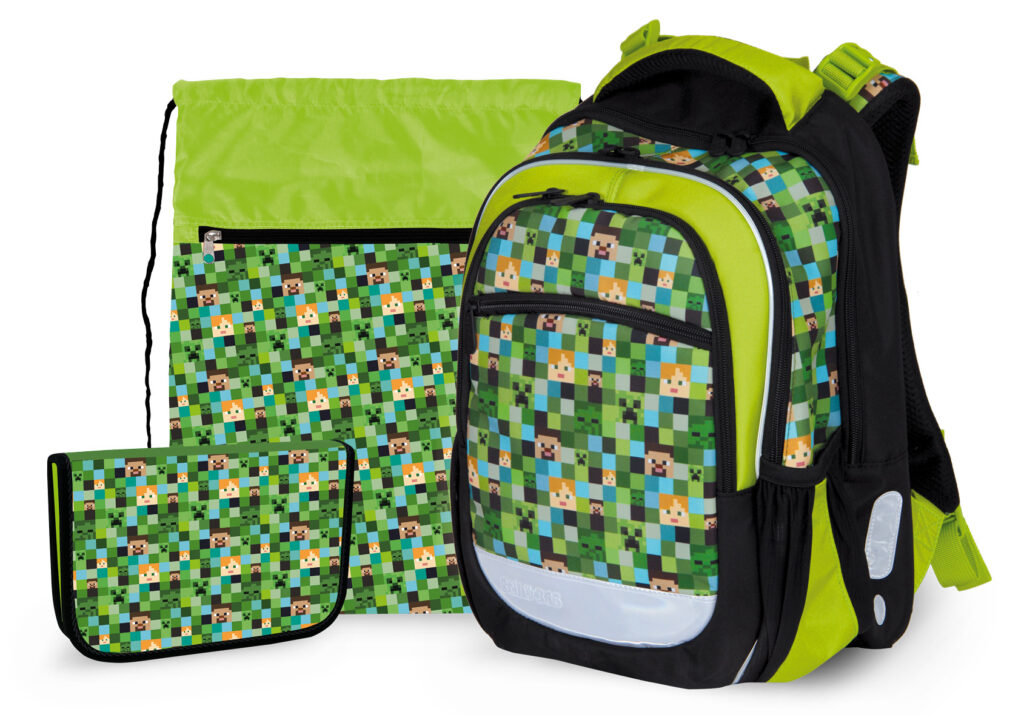 1. Školní batoh junior - kvalitní, ergonomicky tvarovaná odlehčený školní batoh je vybaven reflexními prvky a anatomicky tvarovanými zády s pevnou konstrukcí.2. Školní penál jednopatrový, prázdný s dvěma chlopněmi, o rozměru š.19,5 x v.3,5 x h.13 cm3. Školní sáček na cvičky vhodný pro žáky 1. stupně ZŠ vyroben z pevného, kvalitního materiálu. Rozměr sáčku na přezůvky 44 x 32 mm.