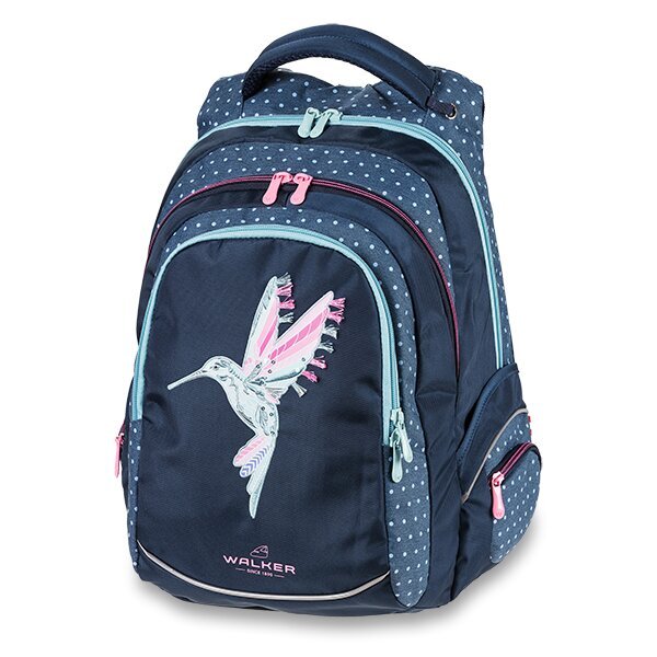 Školní batoh Magic Colibri z řady Walker Fame má polstrovaná záda s odvětrávacími kanálky, výškově nastavitelné popruhy, 3 komory s dalším funkčním členěním a zdvojené boční kapsy.Rozměr: 32 x 44 x 24 cm, objem: 32 l, hmotnost: cca 960 g