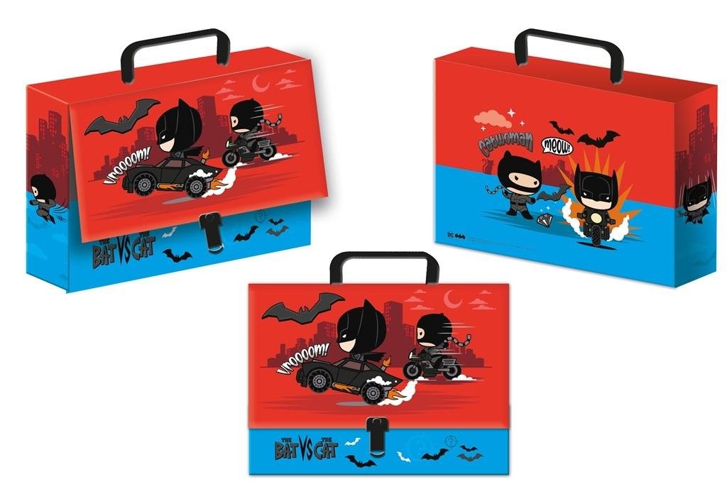 Teczka walizeczka - kartonowa/sztywna teczka z rączką, zapinana plastikowym mechanizmem z przodu. Doskonała dla przechowywania i przenoszenia zeszytów, brulionów, dokumentów, zdjęć, bloków rysunkowych, kredek i wielu innych. Kolorowa na zewnątrz, pokryta połyskową folią, wewnątrz zadruk w jednym kolorze dopasowany kolorystycznie do zewnętrznej części teczki. Motyw z serii Batman