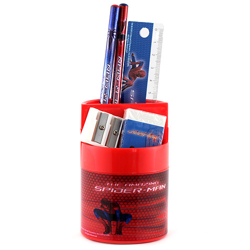 Krásný plastový stojánek se dvěma oddělenými sekcemi umožní přehledné uložení psacích potřeb na dětském stole. Balení včetně náplně dále obsahuje 2x grafitové tužky, plastové pravítko o délce 15 cm, dvojité ořezávátko a velkou mazací gumu. Všechny výrobky včetně stojánku laděné do modro-červené barvy v jedinečném designu oblíbeného seriálového hrdiny Spidermana. Atraktivní a praktické pomůcky pro všechny malé školáky!