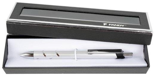 metalowy długopis automatyczny ze srebrną błyszczącą końcówką i klipem, wymienny wkład F-411, niebieski kolor tuszu, grubość linii 0,7 mm, pudełko upominkowe