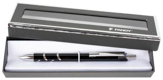metalowy długopis automatyczny ze srebrną błyszczącą końcówką i klipem, wymienny wkład F-411, niebieski kolor tuszu, grubość linii 0,7 mm, pudełko upominkowe