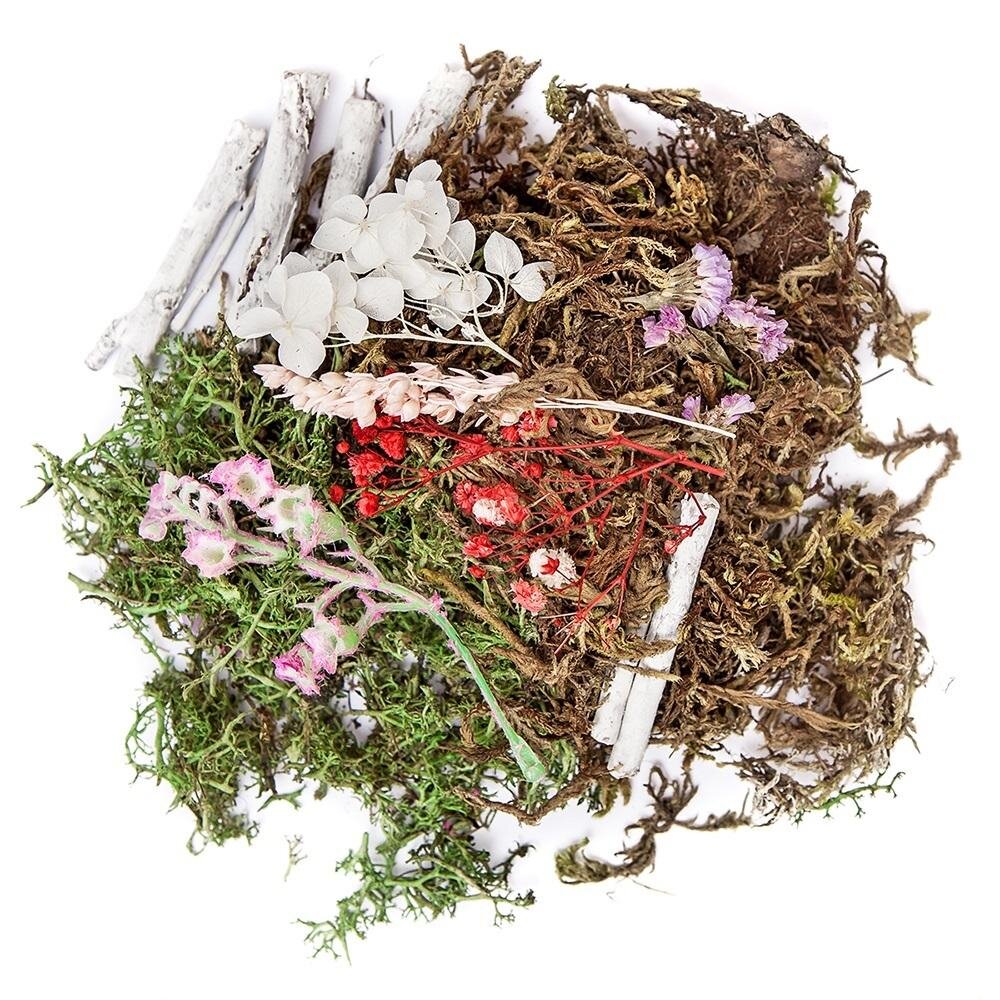 W zestawie znajdziesz mech naturalny, bielone gałązki i suszone kwiaty w pastelowych odcieniach.